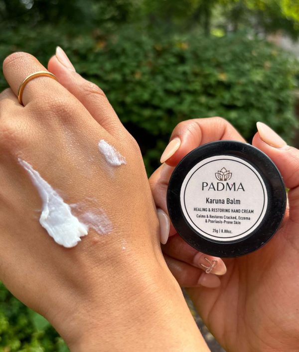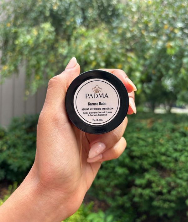 A deeply restorative balm designed to soothe cracked, dry, and sensitive hands. Inspired by Ayurvedic texts and enhanced with therapeutic minerals, Karuna Balm helps calm irritation, reduce flare-ups, and support skin healing—especially for those with eczema or psoriasis-prone skin. Its rich, protective base locks in moisture and provides lasting relief without feeling greasy.
